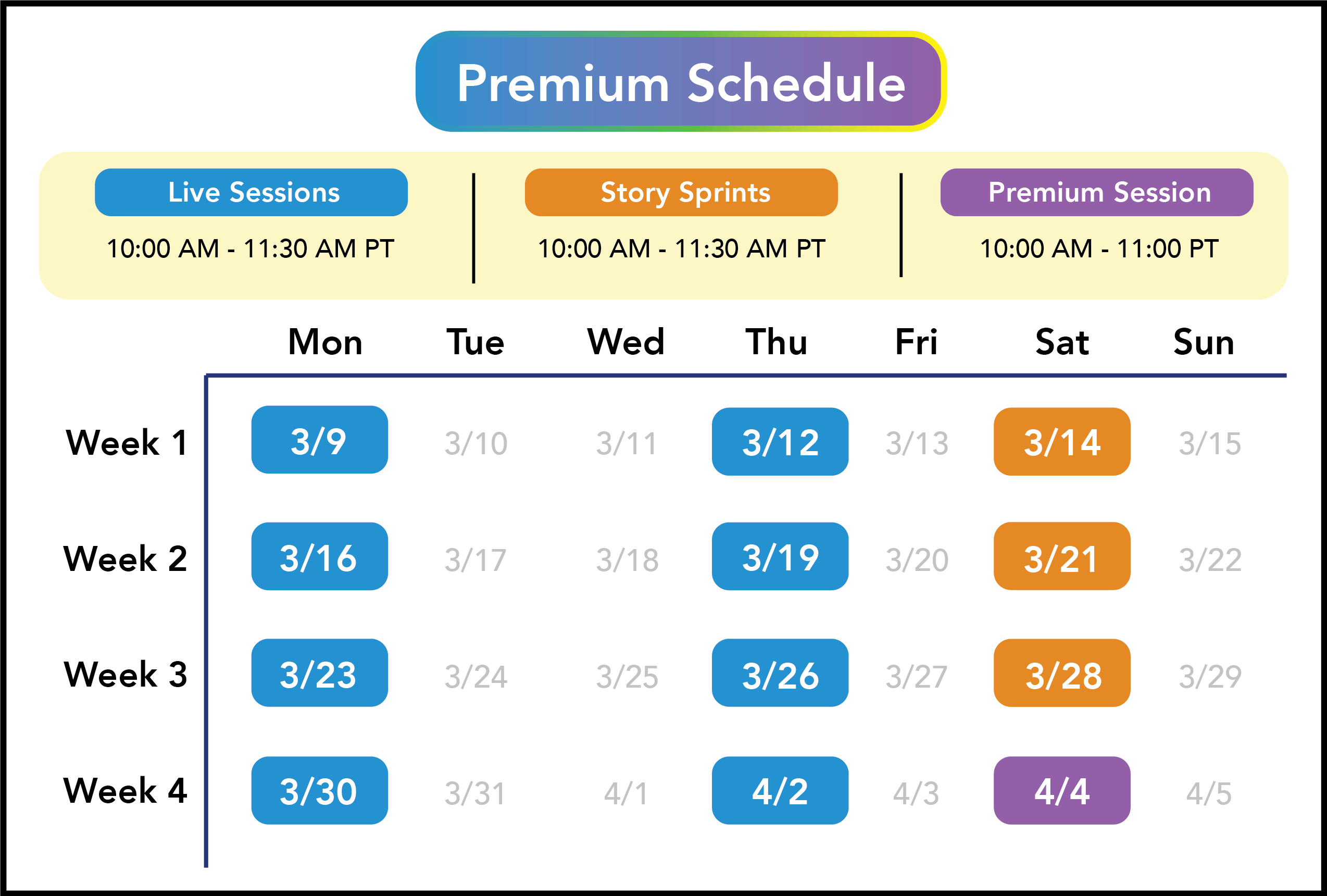 Each session is 90 minutes long, and starts at 10:00 AM PT (view in your time zone).If you join as a Premium student, you will have access to an additional hour-long session. You can view the Premium schedule here.